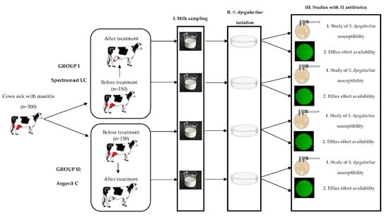 Experimental design diagram for Str. dysgalactiae isolates before and after treatments with Spectromast LC and Argovit-C. Stage I: milk sampling, stage II: Str. dysgalactiae isolation and stage III: studies of antibiotic susceptibility to 31 antibiotics and the efflux effect.