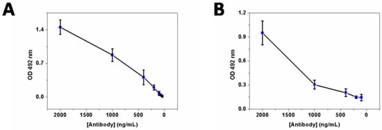 To assess the specificity and capability of the prepared polyclonal rabbit anti−F17A antibody, indirect protein, and whole-cell ELISA (enzyme linked immunosorbent assay) experiment were performed. Different concentrations of the purified antibody were used on F17A protein (5 µg·mL−1) or E. coli F17–positive strain (106 CFU·mL−1) coated ELISA plates. For the purified protein ELISA, we used the purified antibody concentrations ranging from 40 to 2000 ng·mL−1 with detection limit around 100 ng·mL−1 (Figure 2A). For the cell−based ELISA, antibody concentration ranged from 100 to 2000 ng·mL−1 with detection limit around 200 ng·mL−1 (Figure 2B).