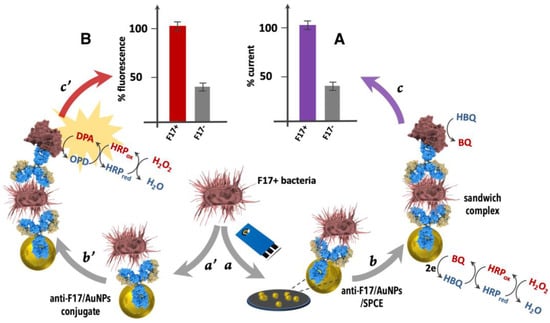 Principle of the (A) Electrochemical and (B) Fluorescence bioassays for E. coli F17A fimbrial protein detection. Steps: (a): adding F17−positive E. coli to anti−F17/AuNPs/SPCE; (b): adding anti−F17−HRP conjugate and (c): adding H2O2/HBQ and electrochemical readout at −0.1 V and (a’): adding F17–positive E. coli to anti−F17/AuNPs conjugate; (b’): adding anti−F17-HRP conjugate and (c’): adding H2O2/OPD and fluorescence readout at 550 nm.