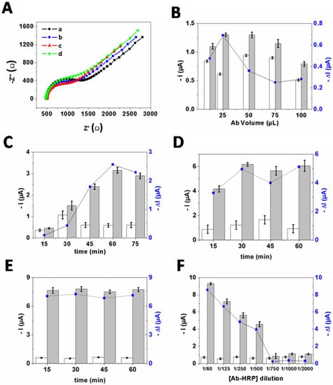 (A) Nyquist plots in 0.01 M PBS (pH 7.4) containing 5 mM K3Fe(CN)6/K4Fe(CN)6 (1:1) of: (a) bare SPCE; (b) Ab−AuNPs/SPCE; (c) F17A/Ab−AuNPs/SPCE; and (d) HRP−Ab/F17A/Ab− AuNPs/SPCE. Optimization of the experimental conditions: (B) the Ab (0.5mg·mL−1) volume used to react with AuNPs solution (500 µL, pH 9.5) for 30 min at RT; (C) the time of immobilization of Ab (0.5 mg·mL−1) onto AuNPs (500 µL, pH 9.5); (D) the time of immobilization of E. coli F17–positive (106 CFU·mL−1) onto Ab−AuNPs/SPCE; (E) the time of immobilization of Ab−HRP (1/125) onto E. coli (F17–positive)/Ab−AuNPs/SPCE; and (F) the Ab−HRP concentration. Current measured before (white bars) and after (grey bars) immobilization of E. coli F17–positive (106 CFU·mL−1). DI is the difference between the current measured before and after reaction with E. coli. The error bars stand for standard deviation recorded with three independent measurements (n = 3).