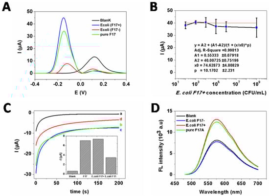 (A) DPV responses of the sandwich electrochemical immunosensor in the absence (a) and presence of E. coli F17−positive (106 CFU·mL−1) (b); E. coli F17−negative (106 CFU·mL−1) (c) and pure F17A protein (1.5 mg·mL−1) (d). (B) The calibration plot of E. coli F17–positive DPV detection where the data was fitted using 4-PL regression analysis. Error bars, SD, n = 3. (C) Amperometric responses of the sandwich electrochemical immunosensor: (a) in the absence of any analyte (blank) and in the presence of (b) pure F17A protein (1.5 mg·mL−1); (c) E. coli F17−positive (106 CFU·mL−1); and (d) E. coli F17−negative (106 CFU·mL−1). (D) Fluorescence emission spectra (λex/(λem: 450/550 nm) of the sandwich immunosensor for the blank (black), in the presence of: 106 CFU·mL−1 of E. coli F17−negative (blue); 106 CFU·mL−1 E. coli F17−positive (ref) and pure F17A protein (1.5 mg·mL−1).
