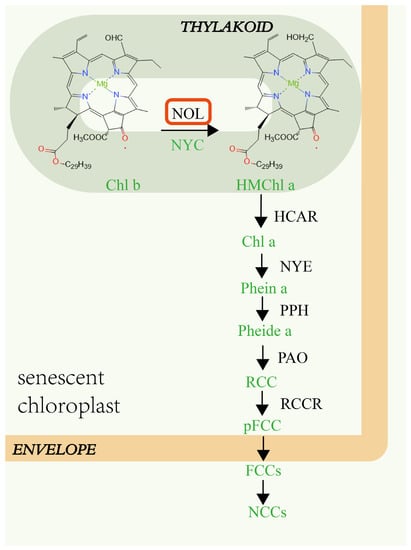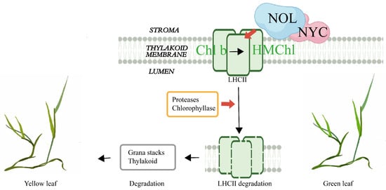 Leaf senescence is a dynamic process in which plants recover nutrients from senescent leaves. Leaf yellowing is a clear indicator of leaf senescence, due to chlorophyll breakdown and carotenoid color exposure. During senescence, cells must degrade free chlorophyll and its color-decomposed metabolites quickly in order to escape photooxidation toxicity []. In higher plants, chlorophyll is a component of the polysubunit thylakoid membrane protein complex, and it occurs in two forms, chlorophyll a (Chl a) and chlorophyll b (Chl b). Chl a is found in all chlorophyll protein complexes, but Chl b is found only in the light-harvesting complex I and II (LHCI and LHCII), which make up the photosystem I complex and photosystem II complex, respectively []. LHCII is mostly found in the grana in the thylakoid membrane’s accumulation area, where it plays a critical role in the creation and maintenance of grana accumulation []. Chlorophyll degradation enzymes (CCEs) have been found to interact with photosynthetic organs. During leaf senescence, LHCII can interact with five chlorophyll-degrading enzymes (NYC, NOL, PPH, PAO, and RCCR) []. Chlorophyll b is converted to chlorophyll a via a two-step process involving chlorophyll b reductase and 7-hydroxymethyl chlorophyll a reductase (HCAR) (Figure 1) []. NYC (non-yellow coloring) and NOL (NYC1-like) are two distinct subtypes of chlorophyll b reductase []. The end product of chlorophyll degradation is a colorless water-soluble linear tetrapyrrole referred to as nonfluorescent chlorophyll catabolites (NCCs), which are stored in the vacuoles of senescent cells. The NOL gene controls the initial degradation of Chl b and promotes its transition into Chl a []. All non-fluorescent chlorophyll breakdown metabolites in higher plants are produced from Chl a, indicating that the transformation of Chl b, mediated by chlorophyll b reductase, is the first step and a critical link in chlorophyll degradation [].