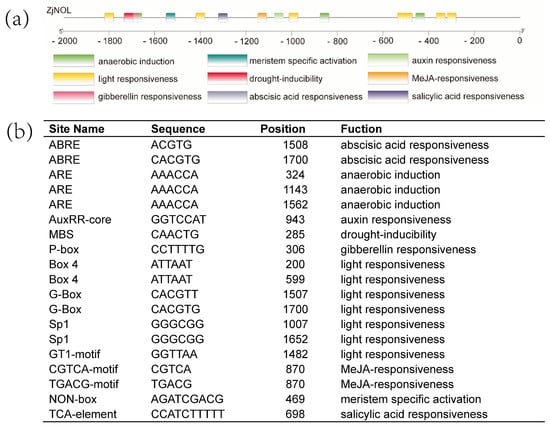 Analysis of upstream sequence of ZjNOL gene. (a) Cis-acting elements upstream of ZjNOL gene. (b) List of predicted binding sites for the transcription factors upstream of ZjNOL gene.