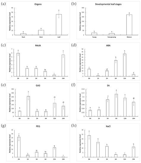 ZjNOL expression profiles. (a) Expression pattern of ZjNOL in the root, stem, and leaf. (b) ZjNOL expression pattern in leaves at various phases of development. (c–f) Leaf expression pattern after 10 mM MeJA treatment (c), 10 mM ABA treatment (d), 10 μM GA3 treatment (e), 0.5 mM SA treatment (f). (g,h) Leaf expression analysis of ZjNOL after 20% PEG4000 (g), 300 mM NaCl (h). Significant differences (p < 0.05, n = 3) are shown by different letters above the columns.