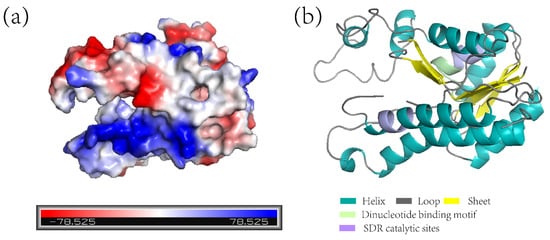 A modelled 3D tertiary structure analysis demonstrated that there was a negative potential area on the surface of the ZjNOL protein, primarily near the helix structure (Figure 5a,b). ZjNOL has a dinucleotide binding motif (TGXXXGXG) and SDR catalytic site (YXXXK) at the position of amino acids 88 and 211 (Figure 5b).