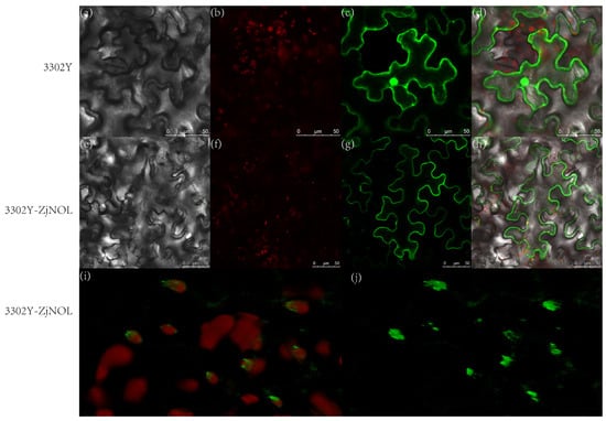Subcellular localization of ZjNOL in cells. (a–d) YFP fluorescent detection. (e–j) Fusion protein of ZjNOL and YFP fluorescent detection. (a,e): Bright light; (b,f): chlorophyll autofluorescence; (c,g,j): YFP fluorescence; (d,h,i): merged signal.