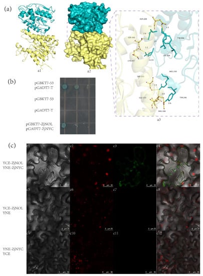 The interaction between ZjNOL and ZjNYC. (a) The binding mode of the complex ZjNYC with ZjNOL. (a1), The backbone of protein was rendered in the tube and colored in blue (ZjNYC) and yellow (ZjNOL). (a2), ZjNOL and ZjNYC proteins were rendered by the surface. (a3), The detailed binding mode of ZjNOL with ZjNYC. Yellow dash represents hydrogen bond or salt bridge. (b) Interaction between ZjNOL and ZjNYC. By 10-fold repeated dilutions, yeast cells were identified on increasing stringency QDO/X/A agar plates. Positive clones were blue, whereas negative clones were white or missing. The negative control was pGBKT7-53 or pGADT7-T, while the positive control was pGBKT7-53 and pGADT7-T co-transformed. (c) The interaction between ZjNOL and ZjNYC in living cells showed by BiFC. (c1–c4), YCE-ZjNOL and YNE-ZjNYC fluorescent detection. (c5–c8), YCE-ZjNOL and YNE fluorescent detection. (c9–c12), YNE-ZjNYC and YCE fluorescent detection. (c1,c5,c9), Bright light; (c2,c6,c10), chlorophyll autofluorescence; (c3,c7,c11), YFP fluorescence; (c4,c8,c12), merged signal. Negative control was YCE-ZjNOL co-expression with YNE or YNE-ZjNYC co-expression with YCE.
