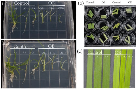 Leaf yellowing phenotype of transgenic creeping bentgrass. (a1,a2) Comparison of transgenic creeping bentgrass (OE) and control on a MS plate. (b) Detached leaves of OE and control at 30-days-old were soaked in 3 mM MES for 0 or 3 days. (c) Comparison of the phenotypes of transgenic creeping bentgrass and control at 30 days.
