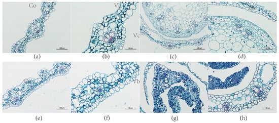 Morphological observation of leaves and stems with saffron solid green stain. (a,b) Leaf of control group; (e,f) leaf of transgenic plant; (c,d) stem of control group; (g,h) stem of transgenic plant; (a,c,e), 200×, scale bar = 100 μm; (b,d,f,g,h), 400×, scale bar = 50 μm. Co, cortex; Vc, vascular column; Vb, vascular bundle. Pi, pith.