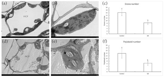 The chloroplasts of OE shifted from a typical spindle shape to an ellipsoidal shape. In comparison to the chloroplasts of the control, the length and width of chloroplasts in OE grew shorter and wider. Furthermore, the average number of grana stacks (GS) in OE cells was significantly lower than those in the control cells (Figure 10). The grana in the chloroplasts of the control leaf cells were well developed and highly stacked, with an average of 13.85 thylakoids per grana layer (Figure 10c). In the chloroplasts of OE, the thylakoid network was plainly incomplete. The number of GS in chloroplasts was reduced to 4–14, and each GS layer contained an average of 6.45 thylakoids (Figure 10f). Some thylakoids developed into long bundles of pseudograna, resulting in essentially the unstacking of the grana and an incompact thylakoid structure that was loose in the chloroplast of OE leaves.