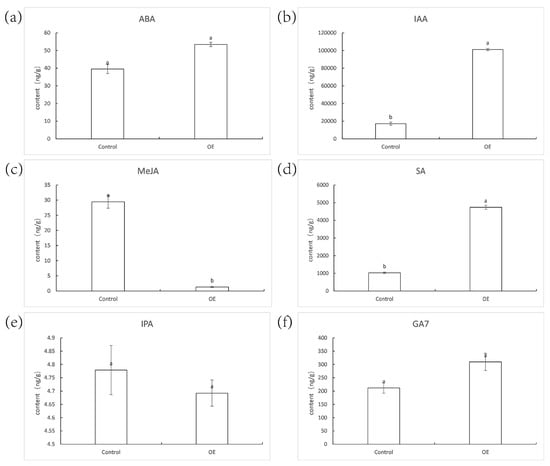 There were no significant variations in the hormone content of ABA, IPA, and GA7 between the control and OE plants (Figure 12). The IAA and SA concentrations in OE were 5.89 and 4.60 times more than in the control, respectively. Simultaneously, the MeJA contents decreased drastically in the transgenic plants, only 4% of the control.