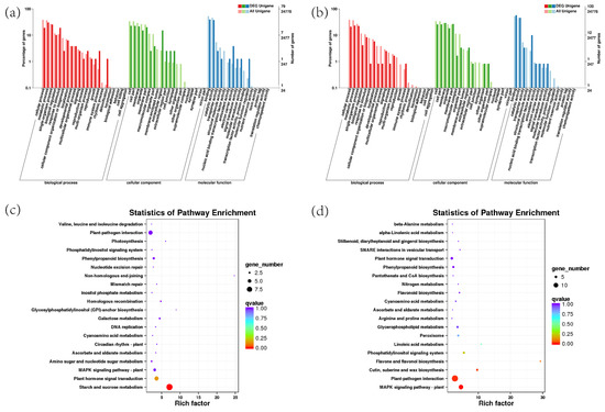 GO and KEGG enrichment analyses for the DEGs. (a,b) GO analysis of up-regulated and down-regulated DEGs; (c,d) KEGG analysis of up-regulated and down-regulated DEGs; significant enrichment was assumed for GO enrichment terms and KEGG enrichment terms, with a p-value of 0.05.