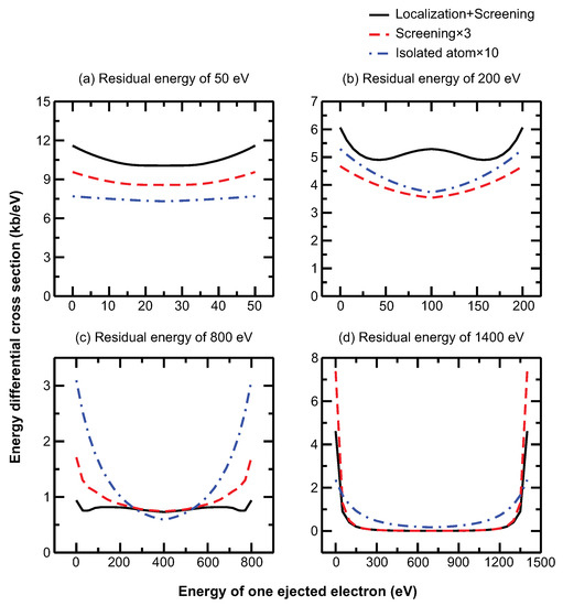 Looking at the results in more detail, we find that, surprisingly, the differential cross section is modified by electron localization in a dense plasma; thus, it exhibits new features. The isolated-ion model predicts a “U-shaped” energy dependence for the energy differential cross section that is steeper at high residual electron energies [34,35,36,37,38,39]. The screened-ion model does not significantly modify this energy dependence, although the differential cross section exhibits some notable differences. If we include the effect of electron localization, however, the U-shaped energy dependence is only approximately maintained at low and high residual energies [see Figure 1a at 50 eV and Figure 1d at 1400 eV]. At an intermediate residual energy, the energy differential cross section differs completely from the isolated- and screened-ion models. At a residual energy of 200 eV [Figure 1b], the differential cross section features two minima, for a single ejected electron, at energies of ∼40 eV and ∼160 eV. With an equal sharing of energy for two continuum electrons (100 eV), the differential cross section features a local maximum, which should be a minimum in the isolated- and screened-ion models. At a residual energy of 800 eV [Figure 1c], we find a nearly equal differential cross section, except at the two ends, with one continuum electron capturing a small fraction of the residual energy and the other capturing the remaining residual energy.