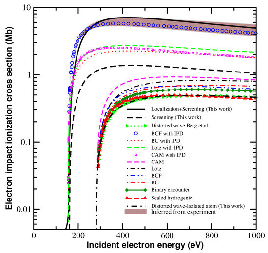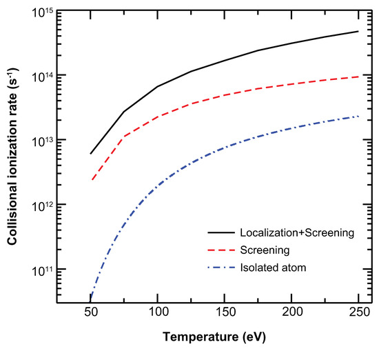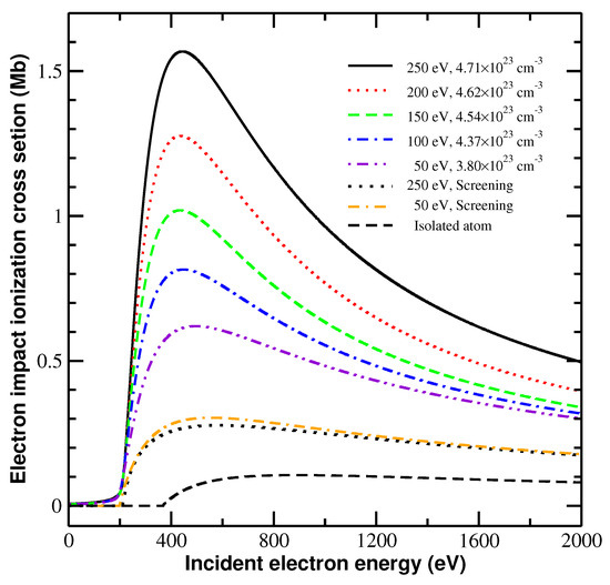 The electron-impact ionization processes of atoms and ions embedded in dense plasma are of interest both for fundamental science and for practical applications in the interiors of stars, including white dwarf and neutron stars [1,2], as well as for binary black holes, inertial confinement fusion [3,4], and high-energy-density plasmas [5,6]. They determine the charge-state distribution and power balance and can also be used to infer the electron temperature and electron density of plasma [7,8,9]. Electron scattering cross sections are required in order to model electron damage and to simulate single electron tracks into biological media [10,11]. To date, most atomic data on electron–ion collisional ionization have been obtained for isolated atoms or ions [7,12,13,14], where the coupling with the plasma environment was assumed to be trivial and was thus neglected. However, these data are only applicable to rarefied plasmas, for which there is, in general, a reasonable agreement between experimental and theoretical cross sections due to the adequate consideration of physical effects, such as by including enough excitation auto-ionization channels in the calculations [15,16]. If the plasma density is sufficiently high and the coupling cannot be neglected, plasma screening plays a non-negligible role and should be considered when determining the electronic structure. The effects of plasma screening on electron-impact ionization cross sections [17,18] have been extensively investigated using various analytical models [19,20,21,22].