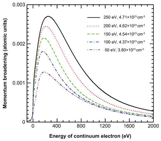 The new features of the differential and integral cross sections of the ions in dense plasma are closely related to the TSLCE of electrons involved in electron-impact ionization. Momentum broadening is an important determinant of localization. Figure 3 shows the momentum broadening as a function of the energy of a continuum electron at plasma temperatures of 50, 100, 150, 200, and 250 eV. The momentum broadening increases rapidly from the ionization threshold up to a peak value, and then decreases much more rapidly with increasing continuum electron energy. This dependence of momentum broadening on energy explains the new features shown in Figure 1 and Figure 2. The energy differential cross section shows the largest modification compared with the isolated and screened ions at a residual energy of 200 eV [Figure 1b], which is a natural result of the TSLCE because the momentum broadening is large near this energy level. However, the TSLCE exerts much less effect at the residual energies of 50 eV [Figure 1a] and 1400 eV [Figure 1d] because of the smaller momentum broadening. Similarly, the pronounced enhancement of the integral cross section in a definite energy range near the threshold shown in Figure 2 also results from momentum broadening.