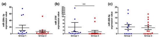 The expression levels of three DE miRNAs in groups 1 and 2: (a) miR-200c-3p, (b) miR-378f, (c) miR-885-5p. Group 1: received fewer than 4 cycles of XELOX chemotherapy. Group 2: received 4–7 cycles of XELOX chemotherapy. ** represents p < 0.01.