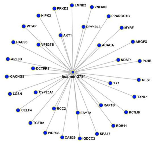 An exact prediction of miRNA targets is important for specificizing the functions of DE miRNAs. As shown in Figure 3, a total of 34 predicted target genes of hsa-miR-378f (blue) were obtained. The DE miRNA and predicted target genes are noted in Supplementary Table S1.