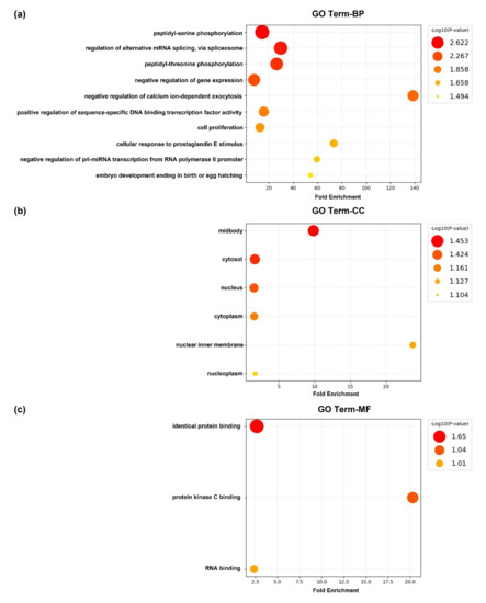The gene ontology (GO) annotation analyses of the predicted target genes of the DE miRNAs. The top 10 most remarkably affected GO terms are listed along the y-axes. The x-axes denote fold enrichment. p < 0.05 was considered to indicate significant enrichment. The color and size of each dot denote –log10 (p-value). (a) The enrichment according to the biological process for the target genes of downregulated DE miRNAs, (b) the enrichment according to the cellular component for the target genes of downregulated DE miRNAs, (c) the enrichment according to the molecular function for the target genes of downregulated DE miRNAs.