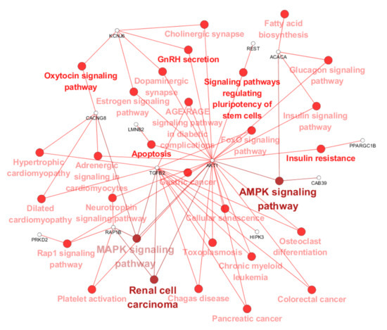 The interaction network represents KEGG pathways and potential target genes. Enriched pathways were obtained from the Kyoto Encyclopedia of Genes and Genomes (KEGG) database.