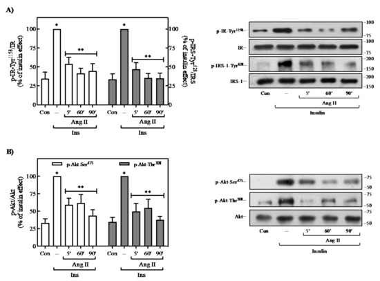 Figure 1. Effect of Ang II on insulin-induced IR, IRS, and Akt phosphorylation. (A,B) 3T3-L1 adipocytes were pre-treated with 100 nM Ang II from 5 to 90 min and then stimulated with 100 nM insulin for an additional 90 min. Under all experimental conditions, cells without treatment were considered as controls. Total cell lysates were separated by SD-PAGE and analyzed by immunoblotting with anti-p-IR Tyr1158, anti-p-IRS Tyr628 (A), anti-p-Akt-Ser473, or an-ti-p-Akt-Ser308 (B), as described in Methods. IR, IRS-1, and Akt phosphorylation was quantitated by densitometry, and the mean values were plotted from three–five independent experiments. Vertical lines represent the S.E.M. Representative immunoblots are presented. Western blots were also probed for total IR and IRS (A), and Akt (B) and used for data normalization. (A,B) * p < 0.05 vs. Con; ** p < 0.05 vs. Ins (--). Con, control; Ins, insulin.