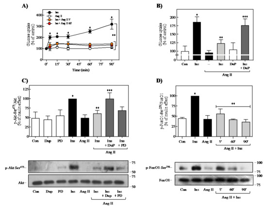 Figure 2. Effect of Ang II on insulin-induced glucose uptake and FoxO1 phosphorylation. (A) 3T3-L1 adipocytes were stimulated with 100 nM Ang II for the indicated times (white circles) or pretreated without (black circles) or with 100 nM Ang II for 5 (orange circles), or 60 min (red circles), and then stimulated with 100 nM insulin for the indicated times. (B) Cells were pretreated with 10 μM DuP 753 for 30 min before treatment with 100 nM Ang II for 60 min and then stimulated with 100 nM insulin for an additional 90 min. Glucose uptake was determined as described in Methods. (C) Cells were pretreated with or without 10 μM DuP 753 or 10 μM PD123177 for 30 min, then were stimulated with or without 100 nM Ang II for 60 min. Finally, the cells were stimulated with or without insulin for 90 min. (D) Adipocytes were pretreated with 100 nM Ang II for 5, 60, or 90 min, and then stimulated with 100 nM insulin for 90 min. Total cell lysates were separated by SDS-PAGE and analyzed by immunoblotting with anti-p-Akt Ser473 (C) and anti-p-FoxO1 Ser256 (D). Under all experimental conditions, cells without treatment were considered as controls. Blots were quantitated by densitometry, and the mean values were plotted from three-independent experiments. Vertical lines represent the S.E.M. Representative immunoblots are presented. Western blots were also probed to detect total Akt (C), and FoxO1 (D) and used for data normalization. (A) * p < 0.05 vs. time 0′; ** p < 0.05 vs. similar times stimulated only by Ins. (B,C) * p < 0.05 vs. Con; ** p < 0.05 vs. Ins; *** p < 0.05 vs. Ins + Ang II. (D) * p < 0.05 vs. Con; ** p < 0.05 vs. Ins. Con, control; DuP, DuP 753; PD, PD123177; Ins, insulin.