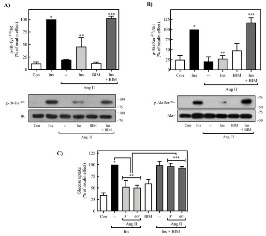 Figure 4. Role of PKC in Ang II-mediated regulation of insulin signaling. 3T3-L1 adipocytes were treated with or without 1 µM BIM for 30 min, then stimulated with or without 100 nM Ang II for 60 min. Finally, the cells were stimulated with or without insulin for 90 min. Total cell lysates were separated by SD-PAGE and analyzed by immunoblotting with anti-p-IR Tyr1158 (A) or anti-p-Akt Ser473 antibodies (B). Blots were quantitated by densitometry, and the mean values were plotted from three–five independent experiments. Western blots were also probed for total IR (A) and Akt (B) and used for data normalization. (C) Cells were treated with or without 1 μM BIM for 30 min, then stimulated with or without 100 nM Ang II for 5 or 60 min, and finally stimulated with or without insulin for 90 min. Glucose uptake was evaluated, as described in the Methods. Under all experimental conditions, cells without treatment were considered as controls. The values are reported as a percentage of insulin effect ± S.E.M. of at least three experiments. (A,B) * p < 0.05 vs. Con; ** p < 0.05 vs. Ins; *** p < 0.05 vs. Ins + Ang II. (C) * p < 0.05 vs. Con; ** p < 0.05 vs. Ins (--); *** p < 0.05 vs. Ang II + Ins (5′, 60′). BIM, BIM I; Con, control; Ins, insulin.