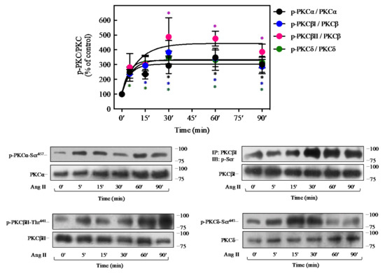 Several studies on 3T3-L1 adipocytes have reported that these cells endogenously express members of the three PKC families: classical (PKCα, PKCβ), novel (PKCδ), and atypical (PKCλ, PKCζ) [47,48]. To investigate which isoforms of PKC are involved in the effect of Ang II on the insulin pathway, it was decided to evaluate the phosphorylation of PKC-isoforms that are expressed in these cells and are inhibited by BIM I, using a temporal course of Ang II from 5 to 90 min of stimulation. It was found by Western blot analysis that Ang II stimulus resulted in the phosphorylation of PKCα, PKCβI, and PKCδ in a time-dependent manner, reaching the maximal effect between 15 and 30 min (~3-fold increase) effect that was maintained up to 90 min of stimulation (Figure 5). Similarly, Ang II promoted PKCβII phosphorylation, reaching a maximal effect at 30 min of Ang II stimulation (about 4.5-fold increase) and decreasing at 90 min (~3.5-fold increase) (Figure 5, pink circles).