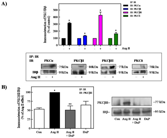 Figure 6. Ang II promotes the association of IR and classical and new isoforms of PKC. (A) 3T3-L1 adipocytes were pretreated with or without 100 nM Ang II for 60 min. (B) Cells were pretreated in the absence or presence of 10 μM DuP 753 for 30 min before treatment with 100 nM Ang II for 60 min. Under all experimental conditions, cells without treatment were considered as controls. Total cell lysates were immunoprecipitated with anti-IR before SDS-PAGE analysis and immunoblotted with anti-PKCα, anti-PKCβI, anti-PKCδ (A), or anti-PKCβII (A,B). Blots were quantitated by densitometry, and the mean values were plotted from three-five independent experiments. Vertical lines represent the S.E.M. Representative immunoblots are presented. Western blots were also probed for total IRβ. (A) * p < 0.05 vs. Con (−). (B) * p < 0.05 vs. Con; ** p < 0.05 vs. Ang II. Con, control; DuP, DuP 753.
