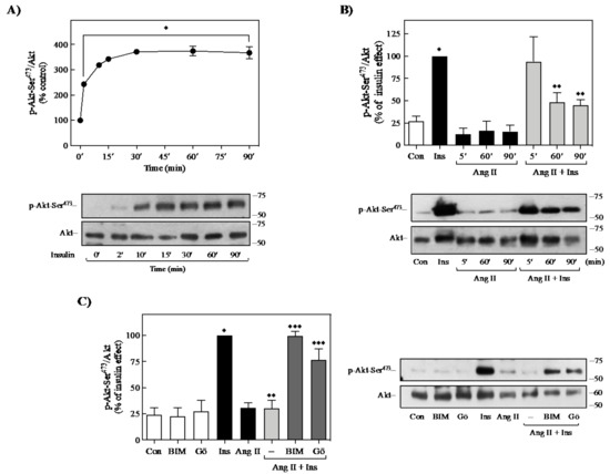 Figure 7. Ang II induces insulin resistance in isolated adipocytes from BALB/c mice. (A) Isolated adipocytes were stimulated with 100 nM insulin for the indicated times. (B) Cells were pretreated with 100 nM Ang II for the indicated times and then stimulated with 100 nM Ins for 10 min. (C) Cells were incubated with 1 μM BIM or 100 nM Gö6976 for 30 min and then stimulated with 100 nM Ang II for 5, 60, or 90 min, and then stimulated with 100 nM insulin for 10 min. Under all experimental conditions, adipose cells without treatment were considered as controls. Total cell lysates were separated by SDS-PAGE and analyzed by immunoblotting with anti-p-Akt Ser473, as described in materials and methods. Akt phosphorylation was quantitated by densitometry, and the mean values were plotted from three independent experiments. Vertical lines represent the S.E.M. Representative immunoblots are presented. Western blots were also probed for total Akt as a loading control. (A) * p < 0.05 vs. time 0′. (B) * p < 0.05 vs. Con; ** p < 0.05 vs. Ins. (C) * p < 0.05 vs. Con; ** p < 0.05 vs. Ins; *** p < 0.05 vs. Ang + Ins (--). BIM, BIM I; Con, control; Gö, Gö6976; Ins, insulin.
