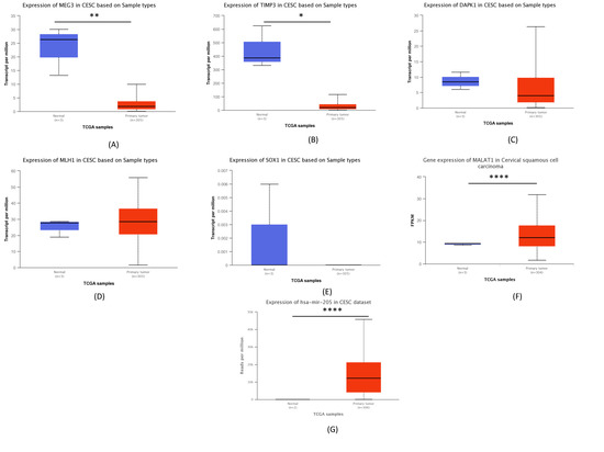 We also used the UALCAN database for TCGA cervical cancer analysis [35]. The cervical cancer database consists of 305 tumor samples and 3 normal samples. In this analysis we evaluated the expression level and survival profile of MEG3, TIMP3, DAPK1, MLH1, SOX1, MALAT1 and miR-205-5p.
