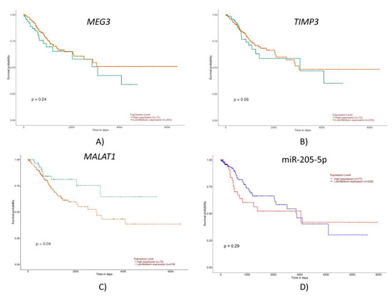 When analyzing the survival curves, the following tendency was noted: higher expression of MEG3, TIMP3 and MALAT1 was correlated to a lower survival rate, while lower expression of miR-205-5p was correlated to a lower survival rate, even though the data were not statistically significant, except for MALAT1 (Figure 3).