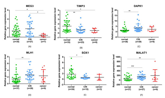 Expression levels of (A) MEG3, (B) TIMP3, (C) DAPK1, (D) MLH1, (E) SOX1 and (F) MALAT1 for normal, cervical intraepithelial neoplasia (CIN) and cancer samples. (* p ≤ 0.05, ** p ≤ 0.01, *** p ≤ 0.0001).