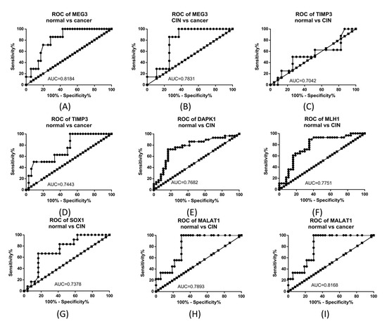 Receiver operating characteristic (ROC) curves for (A) MEG3 normal vs. cancer; (B) MEG3 CIN vs. cancer; (C) TIMP3 normal vs. CIN; (D) TIMP3 normal vs. cancer; (E) DAPK1 normal vs. CIN; (F) MLH1 normal vs. CIN; (G) SOX1 normal vs. CIN; (H) MALAT1 normal vs. CIN; and (I) MALAT1 normal vs. cancer.