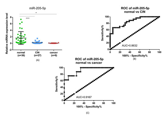 (A) Expression of miR-205-5p in selected samples; (B) ROC curve for miR-205-5p in normal vs. CIN samples; (C) ROC curves for miR-205-5p in normal vs. cancer samples. (* p ≤ 0.05, *** p ≤ 0.0001).