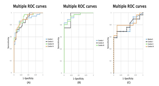 For the analysis of ROC curves of combination targets, we used the CombiROC software [36] for the selected groups of patients, using test signal cutoff 4 and minimum feature 1.
