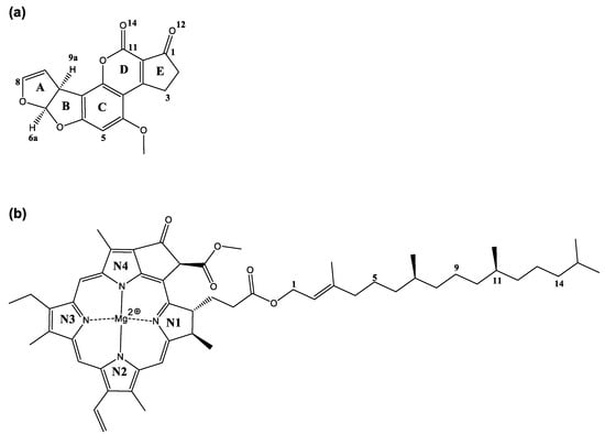 Structures of (a) aflatoxin B1 and (b) chlorophyll a (chl a).