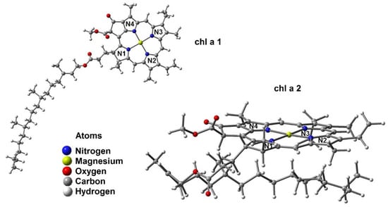 In the computed ground state of chl a, the Mg2+ ion could be axially coordinated by β and α to the oxygen atom of the ketone group, ring E, or with the oxygen atom of the carbonylic lactone group, ring D, such that C1=O12 or C11=O14, respectively. Therefore, it was considered appropriate to carry out these axial interactions, employing both chl a 1 and chl a 2, conformers, as shown in Figures S4 and S5. These interactions were proposed since Mg2+ yields more stable complexes with oxygen atom donors than with nitrogen atom donors, and considering that the coordination number of Mg2+ in porphyrins could be five or six [,].