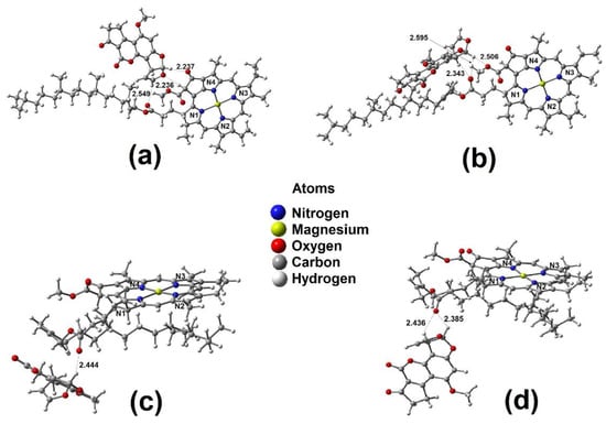 All points made in the previous paragraphs are correlated, and mainly consider interactions with the magnesium ion. In this section, the occurrence of weak hydrogen bond interactions [] between the ester functions of chl a 1 and chl a 2 with AFB1 are discussed and displayed in Table S3 and Figure 4a–d. It is important to remember that the numeration of several atoms is shown in Figure 1.