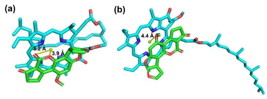 Interaction between chlorophyll and AFB1 obtained by docking studies; (a) chl a 2–AFB1 complex, (b) chl a 1–AFB1 complex.