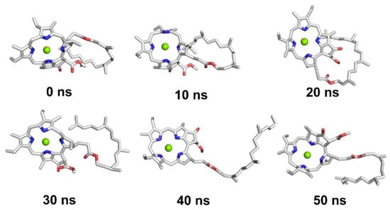MD simulations employ Newton’s law to evaluate the motions of complex systems, thus reproducing the behavior of the biological environment, including water molecules. Specifically, they show the changes in conformational states, which are very important in understanding the recognition pattern of macromolecule–ligand complexes. In this sense, MD simulations are used to identify the motions that can be modeled using this methodology []. To perform MD simulations, chl a 2 was selected as a starting molecule because it is the most stable conformation (−2934.15 Hartrees) in comparison with unfolded conformer chl a 1 [,].