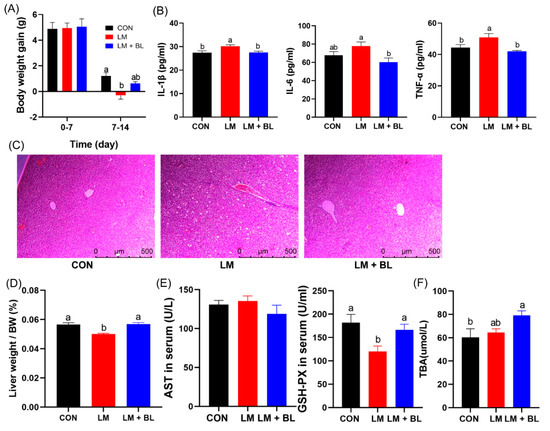 Blood samples were collected from mice in the CON, LM, and LM + BL groups by eyeball extraction. After standing at room temperature, serum was obtained, centrifuged at 4 °C 3000 r/min for 10 min, separated, and stored at −80 °C. Serum levels of IL-1β, IL-6, and TNF-α were measured using commercially available ELISA kits (Multiskan MK3, Thermo Fisher Scientific, Waltham, NC, USA), and GSH-PX and AST were determined according to a kit from the Nanjing Jiancheng Bioengineering Institute (Nanjing, China). Mouse liver was mixed with physiological saline and centrifuged at 2500 rpm and 4 °C for 10 min. Then, the upper tissue homogenate was obtained, after which TBA levels were determined according to kit instructions.