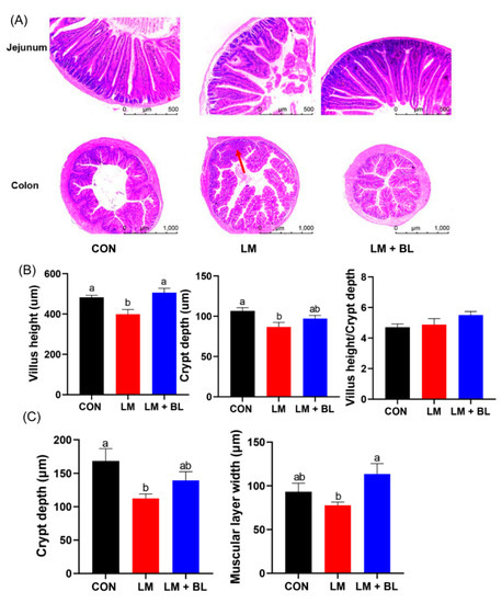 Liver, jejunum, and colon samples were collected according to Xu et al. [72] and perfusion-fixed in formalin for 24 h for intestinal morphology evaluation. Tissue slides were prepared as descried by Fan et al. [73]. Briefly, the liver, jejunum, and colon were sliced into 5 μm thick sections and stained with hematoxylin and eosin (H&E). Villous height and crypt depth from all well-oriented crypt-villi units per sample were measured in the jejunum, and the ratio of villous height/crypt depth was calculated. Then, crypt depths and muscular layer width in the colon were measured.