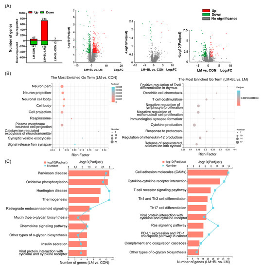 There were 67 upregulated and 141 downregulated DEGs (p-adjust < 0.05 and absolute fold change ≥ 2) in LM vs. CON, 733 upregulated and 158 downregulated DEGs (p-adjust < 0.05 and absolute fold change ≥ 2) in LM + BL vs. LM, and only 7 upregulated and 12 downregulated DEGs (p-adjust < 0.05 and absolute fold change ≥ 2) in LM + BL vs. CON (Figure 2A). The DEGs in LM + BL vs. CON were enriched in the functions of neurons (neuron part, neuron projection, neuronal cell body), cells (cell body, cell projection, respirasome, plasma-membrane-bounded cell projection), and synapses (calcium-ion-regulated exocytosis of neurotransmitters, synaptic vesicle exocytosis, signal release), and were mainly involved in pathways of some disease (Parkinson’s disease, oxidative phosphorylation, Huntington’s disease, thermogenesis, retrograde endocannabinoid signaling), mucin and other types of O-glycan biosynthesis, and insulin secretion (Figure 3B,C). The DEGs in LM + BL vs. LM were enriched in immune functions, such as the regulation of immune cells (T cells, dendritic cells, lymphocytes, and monocytes), cytokine production, and responses to protozoans. KEGG pathway analysis showed that these DEGs were highly enriched in pathways of T-cell receptor signaling; Th1, Th2, and Th17 cell differentiation; cytokine with cytokine receptor; and viral protein interactions (Figure 3B,C). Then, the expression patterns of DEGs that both selected in LM + BL vs. LM and LM vs. CON (p-adjust < 0.05 and absolute fold change ≥ 2) were similar in LM + BL and CON groups, but contrary to the LM group (Figure S2A,B). These DEGs were enriched in mucin type and other types O-glycan biosynthesis pathways (Figure S2C).