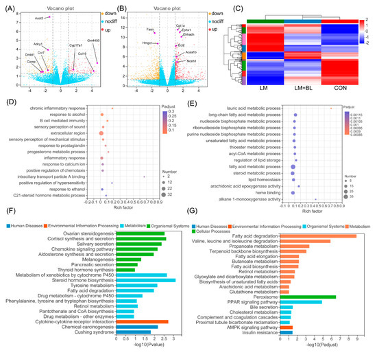 GO enrichment analysis for DEGs in LM vs. CON revealed that they were enriched in pathways related to B-cell-mediated immunity, inflammatory responses, and responses to alcohol (p < 0.05, Figure 4D). KEGG pathway analysis (Figure 4F) revealed that these DEGs were markedly enriched in pathways related to lipid synthesis (ovarian steroidogenesis; cortisol synthesis and secretion; aldosterone synthesis and secretion; fatty acid degradation; phenylalanine, tyrosine, and tryptophan biosynthesis; pantothenate and COA biosynthesis), hormone biosynthesis (thyroid hormone synthesis, steroid hormone biosynthesis, salivary secretion, and pancreatic secretion), and chemotaxis (chemokine signaling pathway, cytokine-cytokine receptor interaction). GO enrichment analysis for DEGs in LM + BL vs. LM (Figure 4E) revealed that they were markedly enriched in lipid metabolism processes (lauric acid, long-chain fatty acid, nucleoside bisphosphate, ribonucleoside bisphosphate, purine nucleoside bisphosphate, unsaturated fatty acid, thioester, acyl-CoA, and fatty acid, as well as steroid metabolic process) and lipid homeostasis (regulation of lipid storage, lipid homeostasis, arachidonic acid epoxygenase activity, heme binding, alkane 1-monooxygenase activity). KEGG pathway analysis revealed that these DEGs (Figure 4G) were enriched in pathways related to lipid degradation (fatty acid degradation; valine, leucine, and isoleucine degradation; propanoate metabolism; cholesterol metabolism), fatty acid metabolism (terpenoid backbone biosynthesis, fatty acid elongation, butanoate metabolism, retinol metabolism, peroxisome), bile secretion, and signaling pathways (PPAR and AMPK signaling pathways).