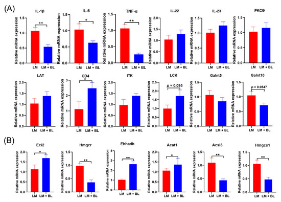 To validate the RNA-seq results, qRT-PCR analysis was conducted for key DEGs and related cytokines in the colon and liver. The mRNA expressions of CD4 in colons of LM + BL were significantly greater than those of LM (Figure 5A, p < 0.05), mRNA expressions of LCK in LM + BL were increased, compared to LM (p = 0.095), and Galnt10 levels in the colon were decreased (p = 0.0547). Expressions of IL-22, IL-23, PKCθ, LAT, ITK, and Galnt5 in the colon exhibited similar patterns with RNA-Seq (Figure 5A). In addition, relative mRNA expressions of TNF-α, IL-1β, and IL-6 in the colons from the LM + BL group were significantly decreased, compared to LM (Figure 5A, p < 0.05). The mRNA expressions of Eci2, Ehhadh, and Acat1 in livers were significantly increased, while Hmgcr, Acsl3, and Hmgcs1 levels in livers of the LM + BL group were decreased, compared to LM (Figure 5B), consistent with findings from RNA-seq.