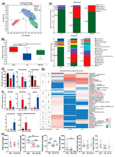 Colon microbiome. (A) PCoA analyze. (B) Alpha-diversity of fecal microbiota in colon chyme of Shannoneven index. (C) Relative abundance of microbiota at the phylum level and genus levels. (D) Heat map and trend of bacterial at the genus level. (E) Phylum level bacterial statistical comparison in three groups. (F) Genus level bacterial statistical comparison in three groups. (G) Scatter plot for short-chain fatty acid concentration in colon contents (n = 10 in CON and LM, n = 8 in LM + BL). Intergroup difference test was performed by Wilcoxon rank-sum test. * means statistically significant (p < 0.05), ** means p < 0.01. Less than 1% abundance of the phyla or genus was merged into others. Different letters indicate significant differences between the two groups (p < 0.05), while the same letter indicates insignificant differences (p > 0.05).