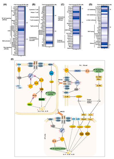 Transcriptomics revealed that baicalin regulates intestinal immunity and repairs intestinal damage. Fold change of differentially expressed genes related to (A) NF-κB signaling pathway and ras signaling pathway; (B) intestinal immunity cell adhesion molecules and complement and coagulation cascades; (C) chemokine signaling pathway and O-glycan biosynthesis; (D) cytokine–cytokine receptor interaction as well as T-cell receptor signaling pathway; and (E) the process of Th1/Th2 and Th17 cell differentiation. The red arrows indicate upregulation.