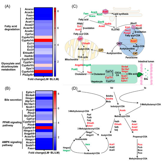 Transcriptomics revealed that baicalin regulates lipid metabolism and bile secretion. Fold change of differential expressed genes related to (A) fatty acid degradation and glyoxylate and dicarboxylate metabolism, and (B) bile secretion, PPAR signaling pathway, and AMPK signaling pathway. (C) The process of fatty acid degradation, peroxisome, fatty acid biosynthesis, and bile secretion. (D) The process of glyoxylate and dicarboxylate metabolism. The red words indicate upregulation and green words indicate downregulation.