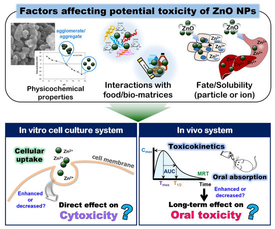 - Yu, J.; Choi, S.J. Particle size and biological fate of ZnO do not cause acute toxicity, but affect toxicokinetics and gene expression profiles in the rat livers after oral administration. Int. J. Mol. Sci. 2021, 22, 1698. [Google Scholar] [CrossRef] [PubMed]