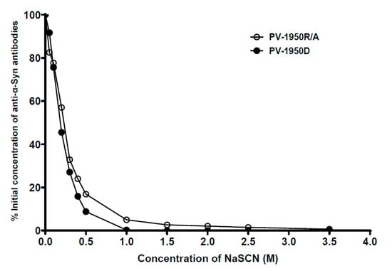 Purification of anti-hα-Syn antibodies: Anti-hα-Syn antibodies from sera of mice immunized with PV-1950D and PV-1950R/A vaccines were purified by an affinity column (SulfoLink, ThermoFisher Sci., Waltham, MA, USA) using an immobilized α-Syn85–99-C, α-Syn109–126-C, and α-Syn126–140-C peptides (GenScript Company, Piscataway, NJ, USA). Sera were divided into three equal volumes. Each aliquot was purified by a column immobilized with one of three peptides, according to manufacturer recommendations. Purified antibodies were analyzed via 10% Bis-Tris gel (ThermoFisher Sci.), and the concentrations were determined using a BCA protein assay kit (ThermoFisher Sci.). Equal amounts of α-Syn85–99, α-Syn109–126, and α-Syn126–140 antibodies were mixed for avidity measurement.
